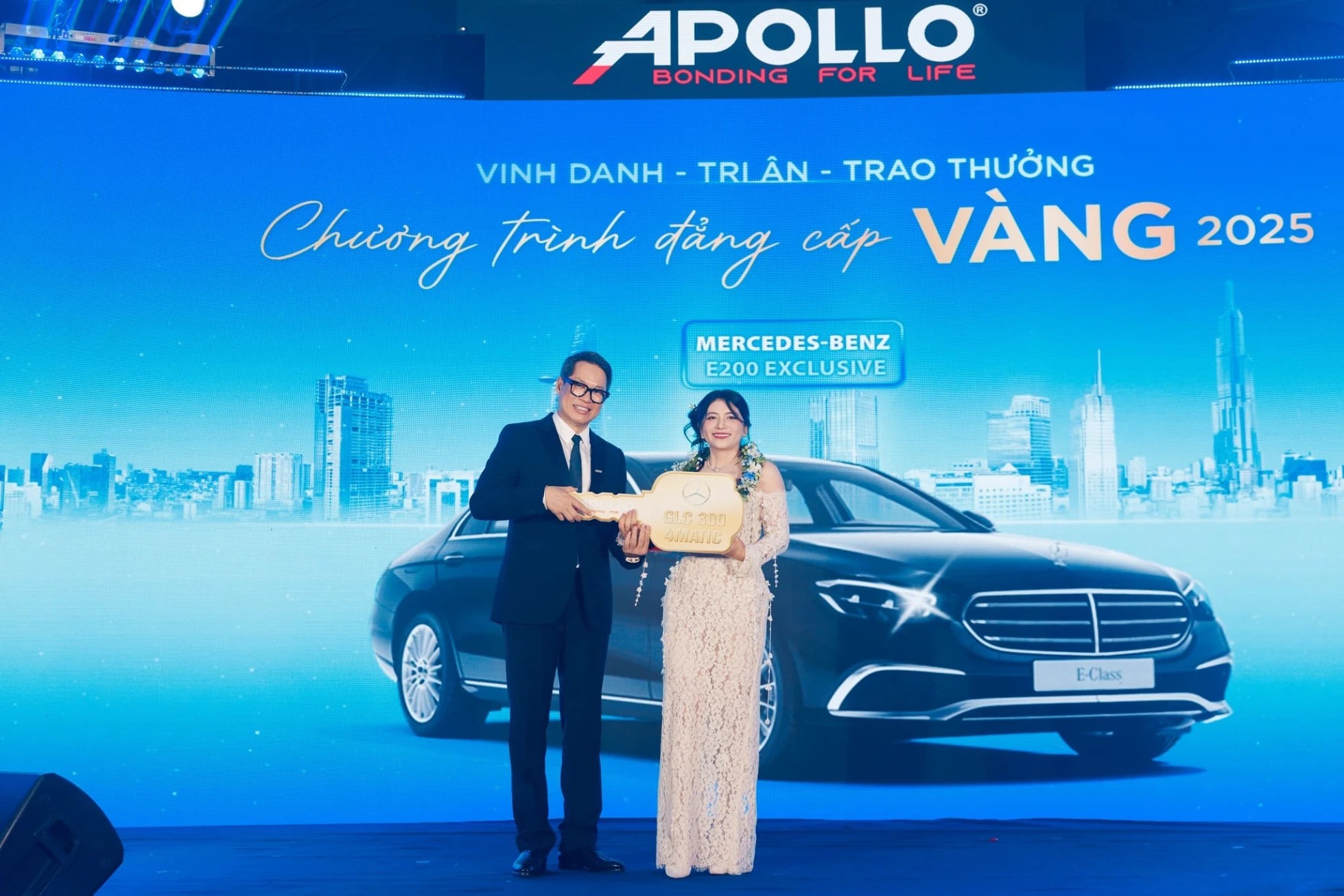 Bên cạnh danh vị Nhà Phân Phối Kim Cương, Apollo trao tặng giải thưởng Đẳng Cấp Vàng với phần thưởng là xe Mercedes E200 Exclusive hoặc Mercedes-Benz GLC 300 4MATIC, nhằm ghi nhận những nỗ lực xứng đáng và thành tích nổi bật trong năm 2025. Đặc biệt, các Nhà Phân Phối Kim Cương còn được Apollo dành tặng riêng 01 xe Ford Ranger Wildtrak 2025 như lời tri ân cho sự tin tưởng, hợp tác bền vững và đồng hành lâu dài qua nhiều giai đoạn phát triển.